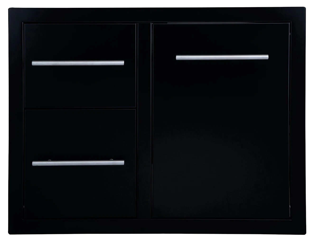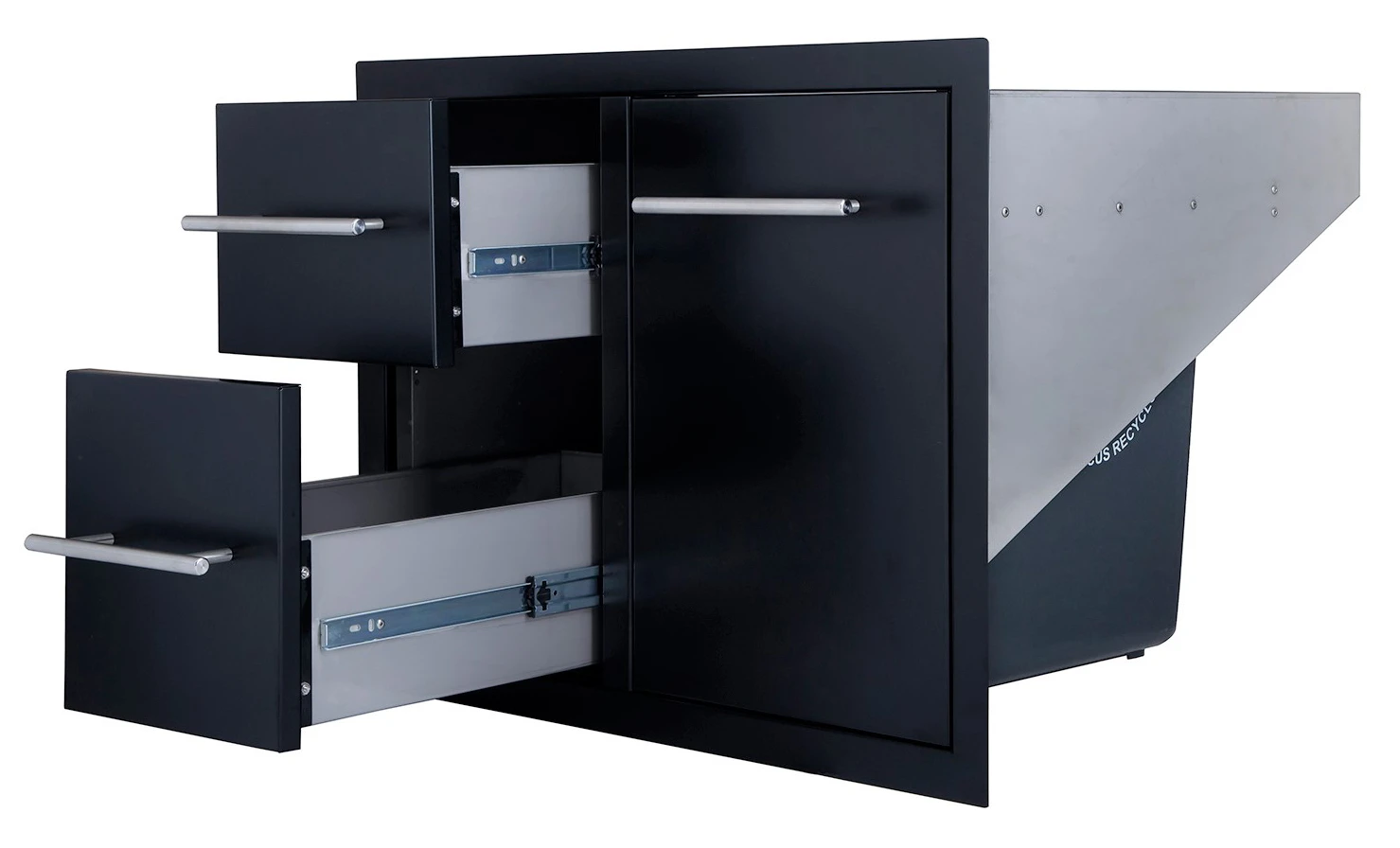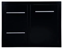 La cajonera doble + cajón para la botella de gas o el cubo de basura está fabricada de Acero Inoxidable esmaltado en negro y con los tiradores de acero pulido. Una vez instalada queda completamente a ras, así que es perfecta para diferentes tipos de superficies como piedra, cemento, etc.