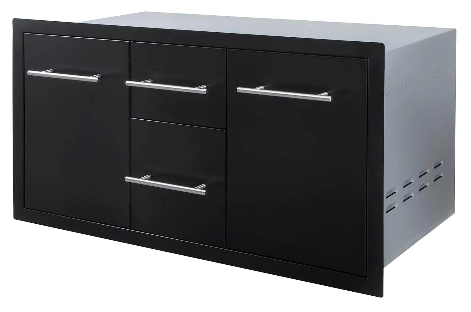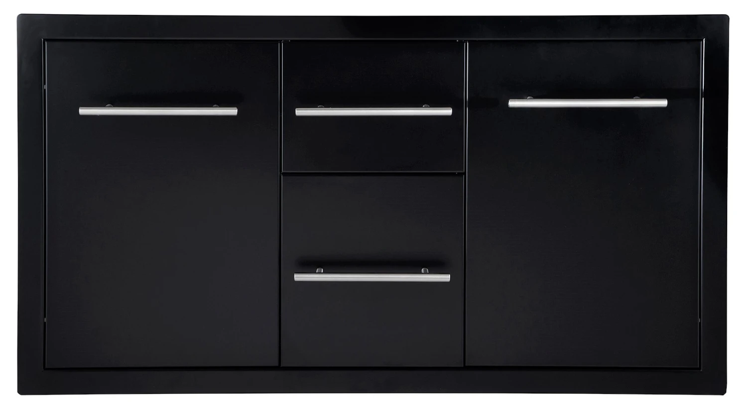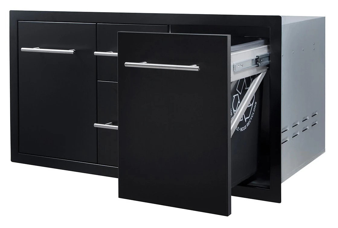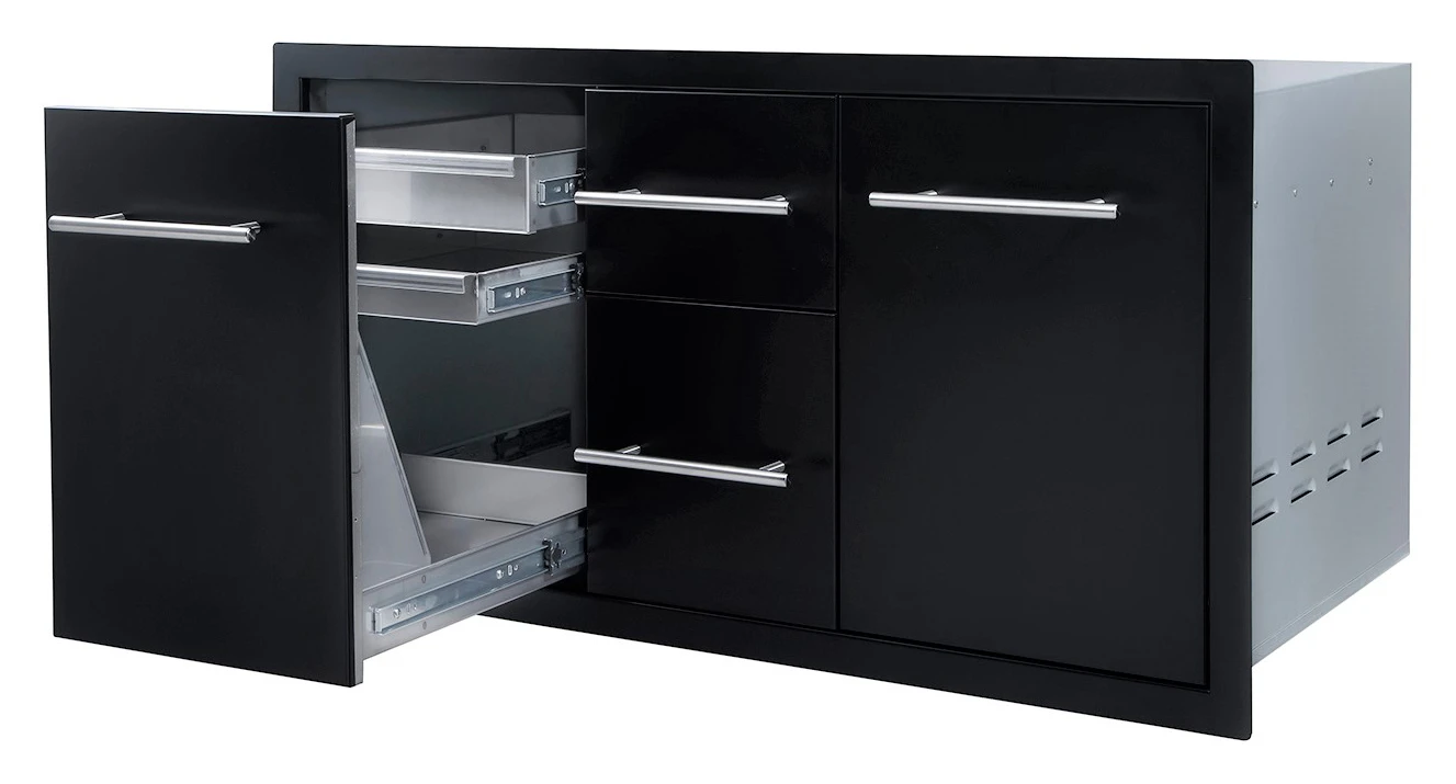 La cajonera triple grande + cajón botella gas o cubo basura está fabricada con de Acero Inoxidable esmaltado en negro y con los tiradores de acero pulido.. Una vez instalada queda completamente a ras, así que es perfecta para diferentes tipos de superficies como piedra, cemento, etc.