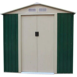 El modelo de caseta metálica Cambridge está fabricado en Acero Galvanizado y pre-tinte en caliente. Cuenta con paneles laterales nervados, puerta corredera doble, tejado a dos aguas y respiradero. No incluye suelo.