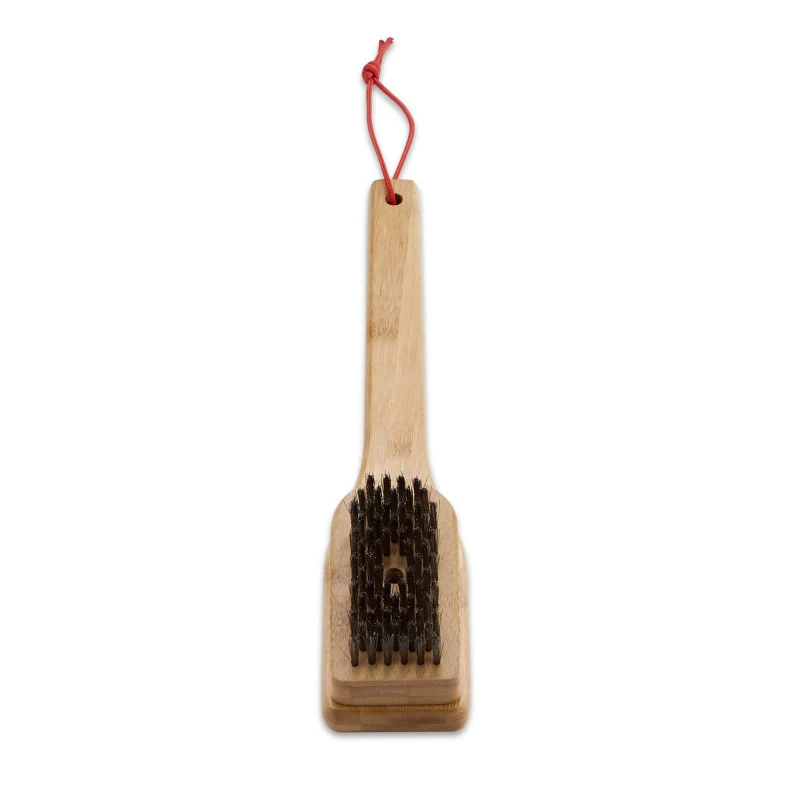 Este cepillo para parrillas, fabricado en bambú, está diseñado para limpiar fácil y eficazmente los alimentos, la grasa y los residuos incrustados en parrillas de todos los tamaños. El cabezal con cerdas en ángulo te permite desprender los restos adheridos sin acercarte demasiado a la fuente de calor.