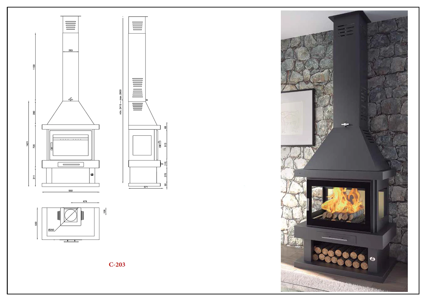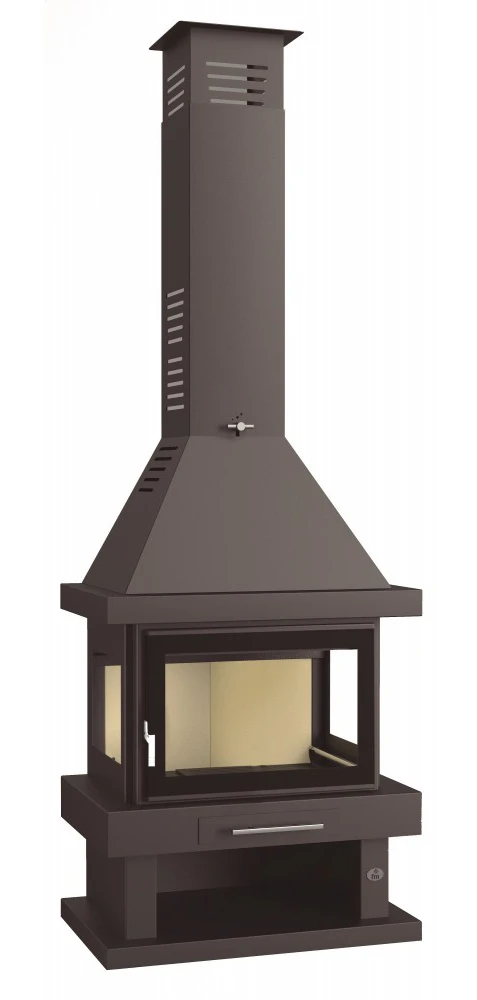 Diseño clásico con leñero, en el que se ha conseguido un gran aprovechamiento de su poder calorífico.