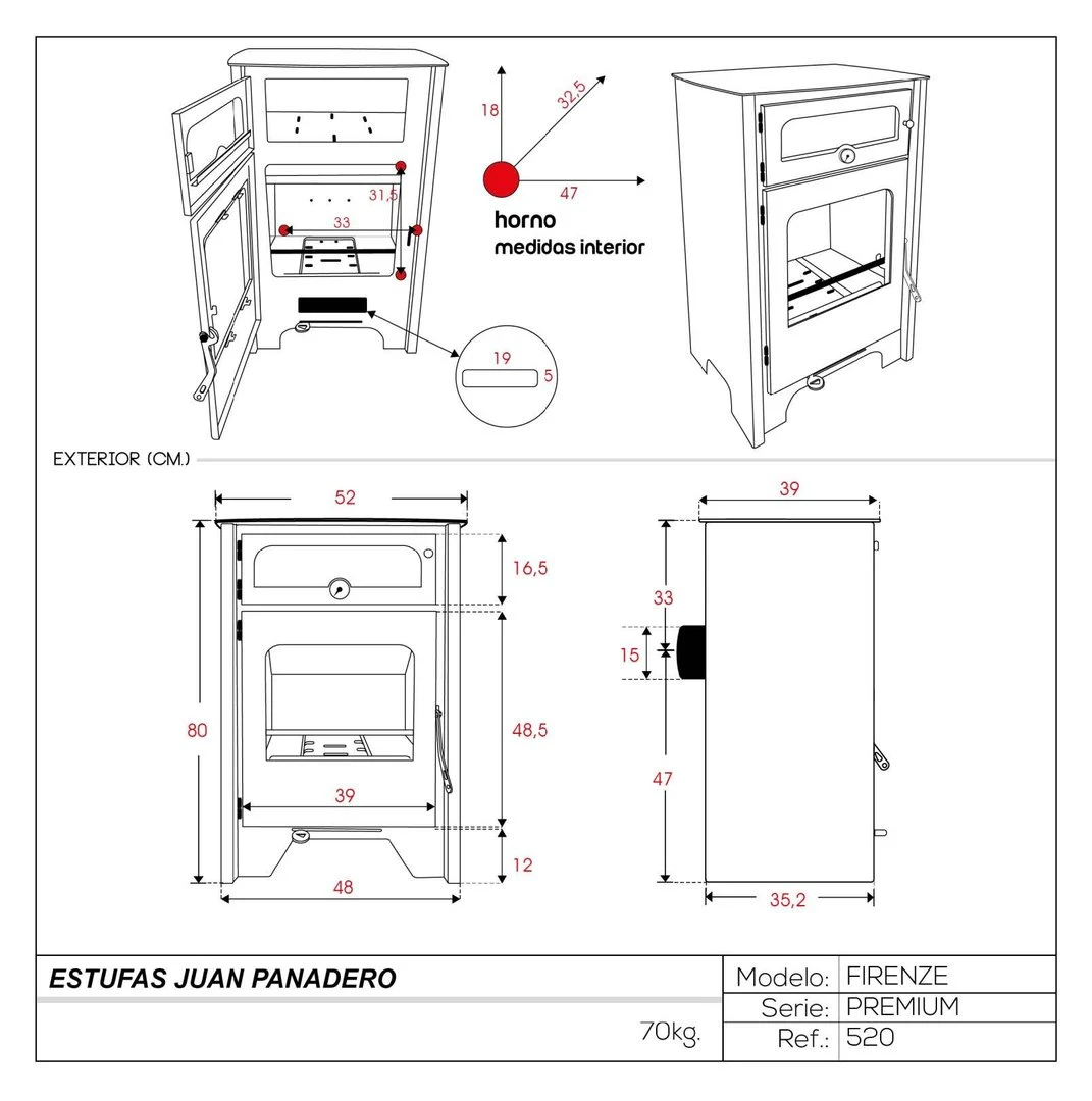 Estufa frontal de diseño muy actual fabricada en acero pintado en color gris oscuro. Puerta con cristal vitrocerámico. Leñero incorporado. Incluye un amplio horno, con termómetro de control.