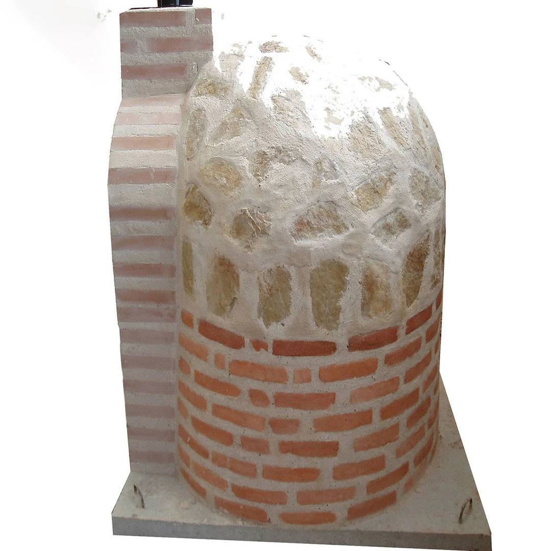 El modelo Hornilla redonda Mixta Piedra se caracteriza por su sencillez, y está terminado en piedra de cantera natural en la parte de la cúpula y de ladrillos refractarios en la parte de la hornilla, manteniendo su esencia artesana y un acabado rústico y tradicional. La construcción se apoya sobre una base de hormigón armado.