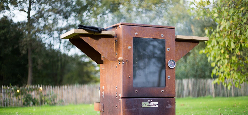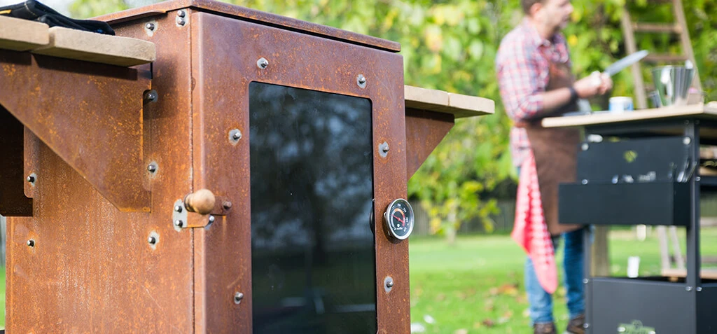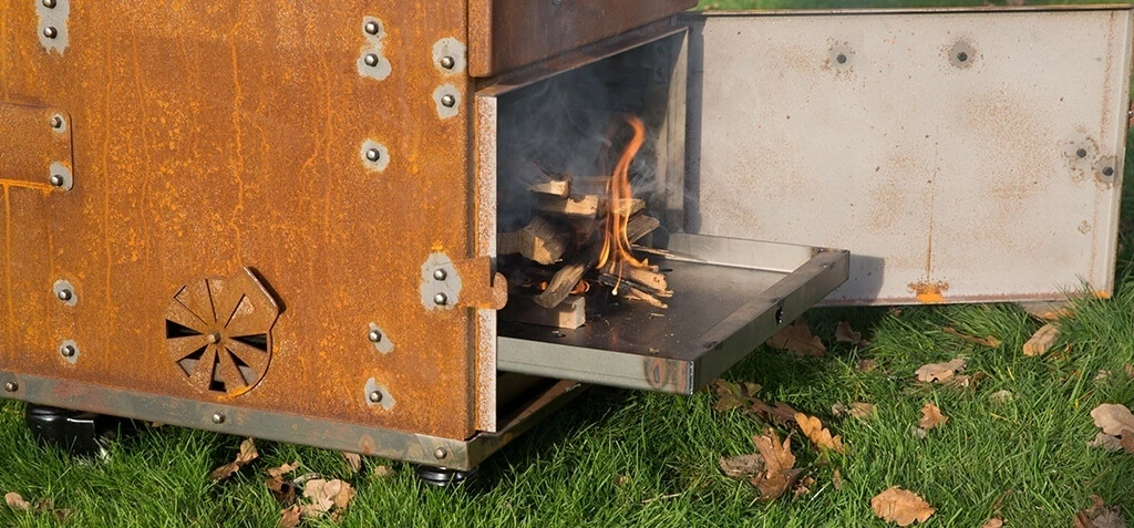 En el Horno Multifunción Pure Corten, horno y ahumador comparten el mismo espacio, lo único que debe hacer es verter el contenido para ahumar en el cajón y colocarlo en la ranura localizada encima del fuego, el calor de éste hará que el cajón se caliente y la madera utilizada empezará a humear. La ventaja de que el cajón para ahumar y el fuego se encuentren en ranuras diferentes es que el fuego sigue ardiendo lo que permite que el horno mantenga su calor de forma constante.