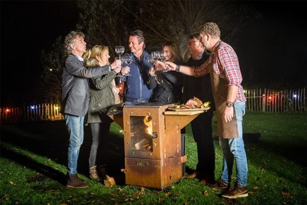 Coloque el fuego y el cajón de la ceniza en la posición más baja y su Horno Multifunción Pure Corten Le Maître podrá ser utilizado como una atmosférica chimenea de terraza. El fuego es bellamente visible a través de la placa de cristal endurecido. Esto le permitirá disfrutar durante más tiempo de la deliciosa cena que acaba de tomar.