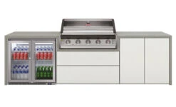 El cuerpo de las islas de exterior Beefeater está fabricado con madera de eucalipto contrachapada de grado marino resistente a la humedad y rematada con un laminado de color blanco fácil de limpiar.