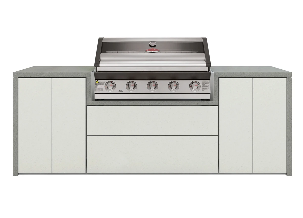 El cuerpo de las islas de exterior Beefeater está fabricado con madera de eucalipto contrachapada de grado marino resistente a la humedad y rematada con un laminado de color blanco fácil de limpiar.