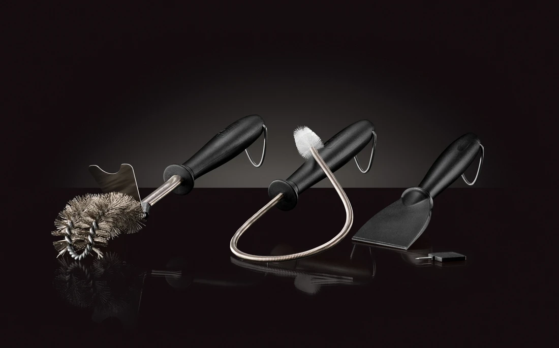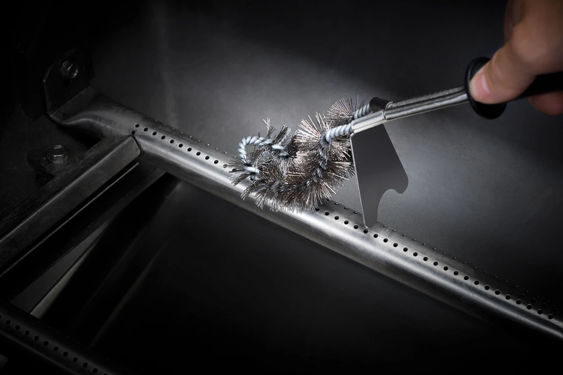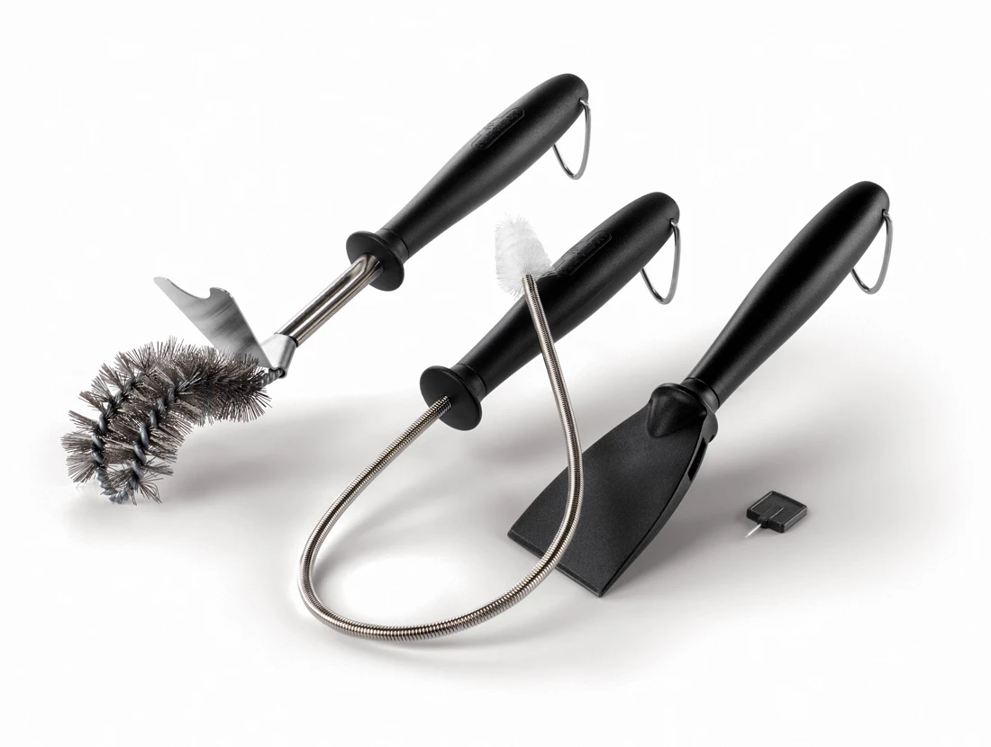 El juego incluye un cepillo de limpieza de la parrilla de cocción en ángulo con un raspador de parrilla, un cepillo de limpieza para el quemador tipo venturi, un raspador de la cámara de combustión que no daña el acero y un limpiador de los orificios del quemador que se guarda en el raspador de la cámara de combustión.