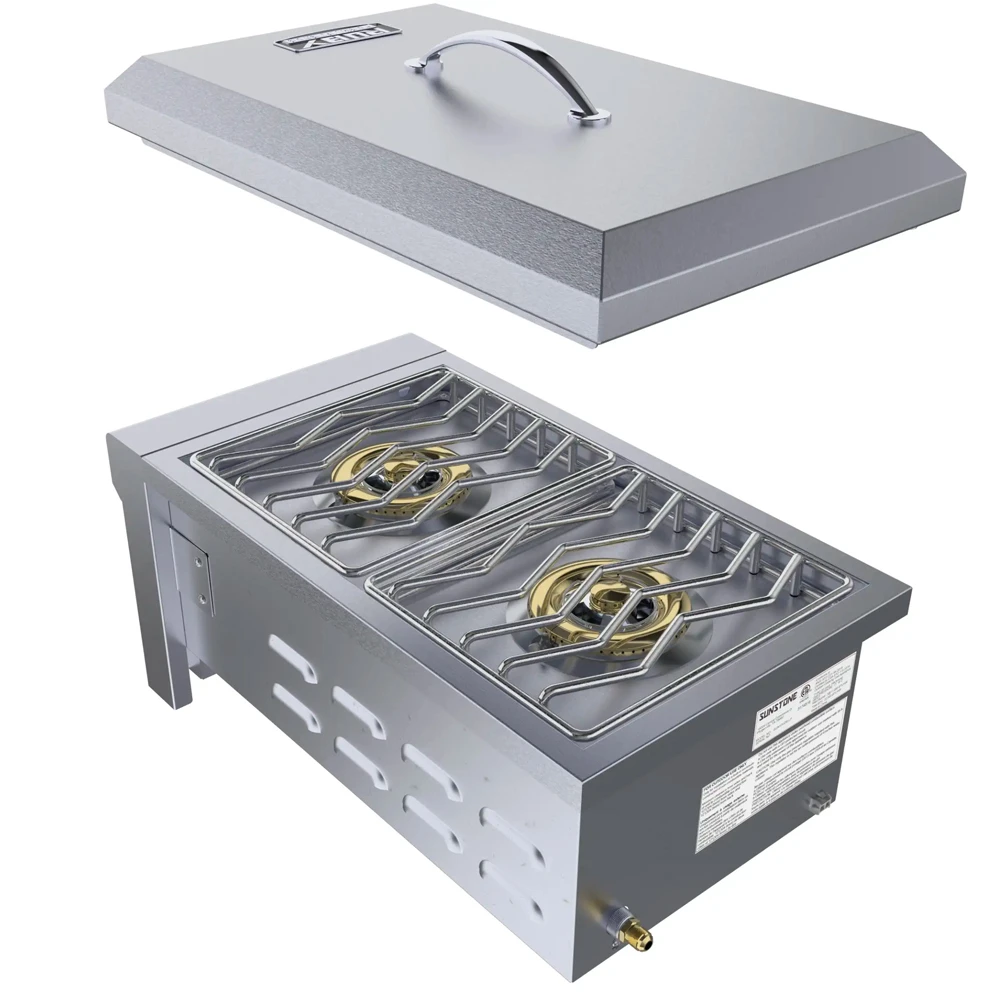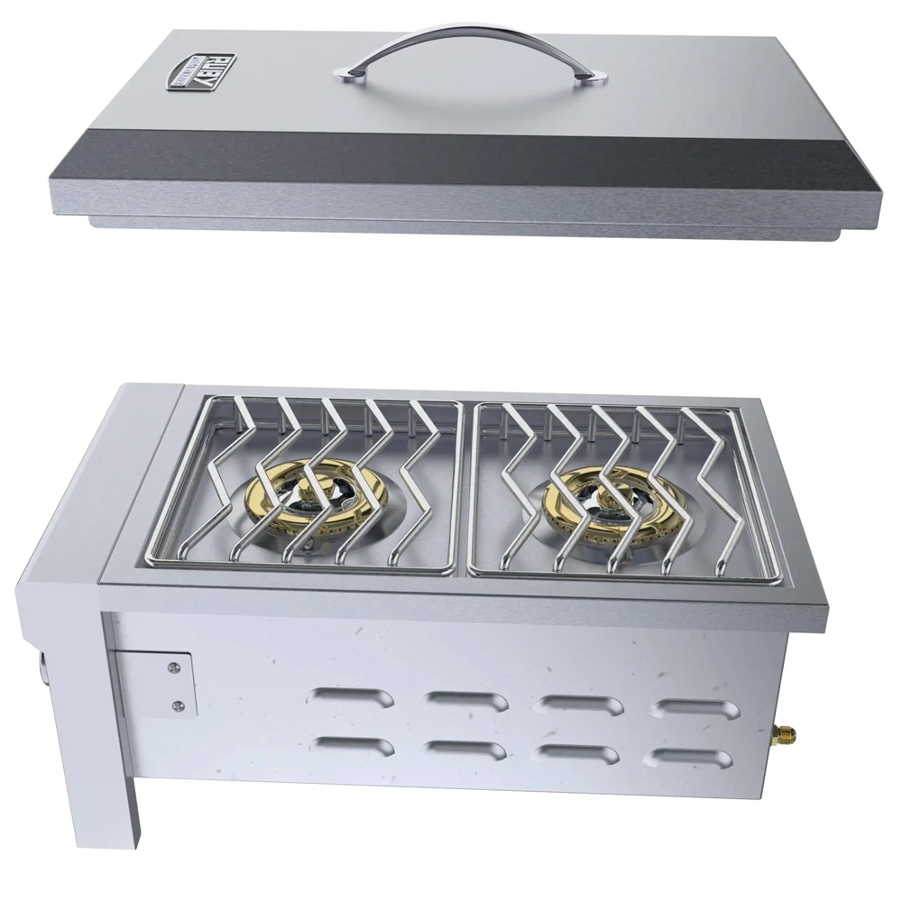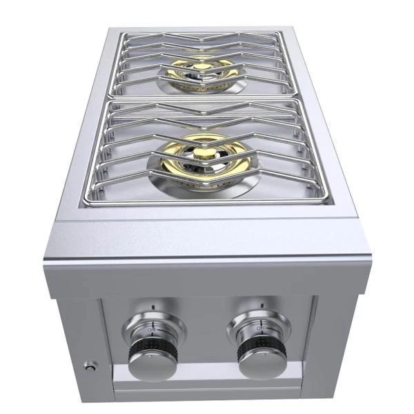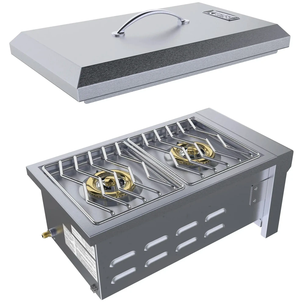 El Quemador de gas Doble Versa Ruby cuenta con dos quemadores de alta resistencia de hasta 4,4 kW por quemador, con un total de 8,8 kW, todos los quemadores de latón con una garantía de por vida, y todos construidos de Acero Inoxidable 304 de calibre 18, complementando esto con parrillas de cocción de Acero Inoxidable sólido.